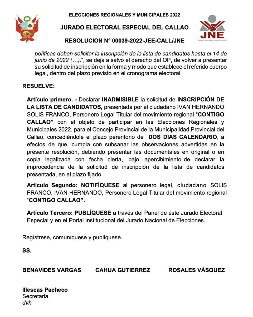 El mismo 16/06 (ayer) el JEE responde confirmando la IMPROCEDENCIA de la inscripción de "Contigo Callao" y otorgando el plazo de 1 DÍA CALENDARIO para apelar la improcedencia.